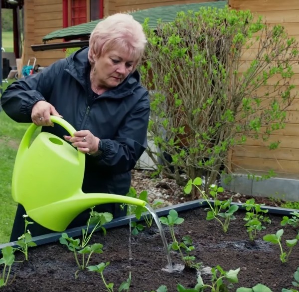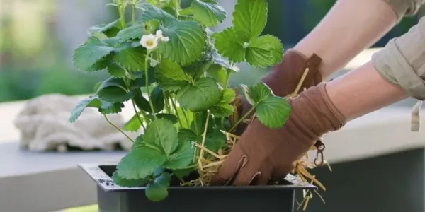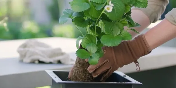 Nyní naplňte vložku zeminou a nechte trochu místa pro kořenový bal jahodníku.