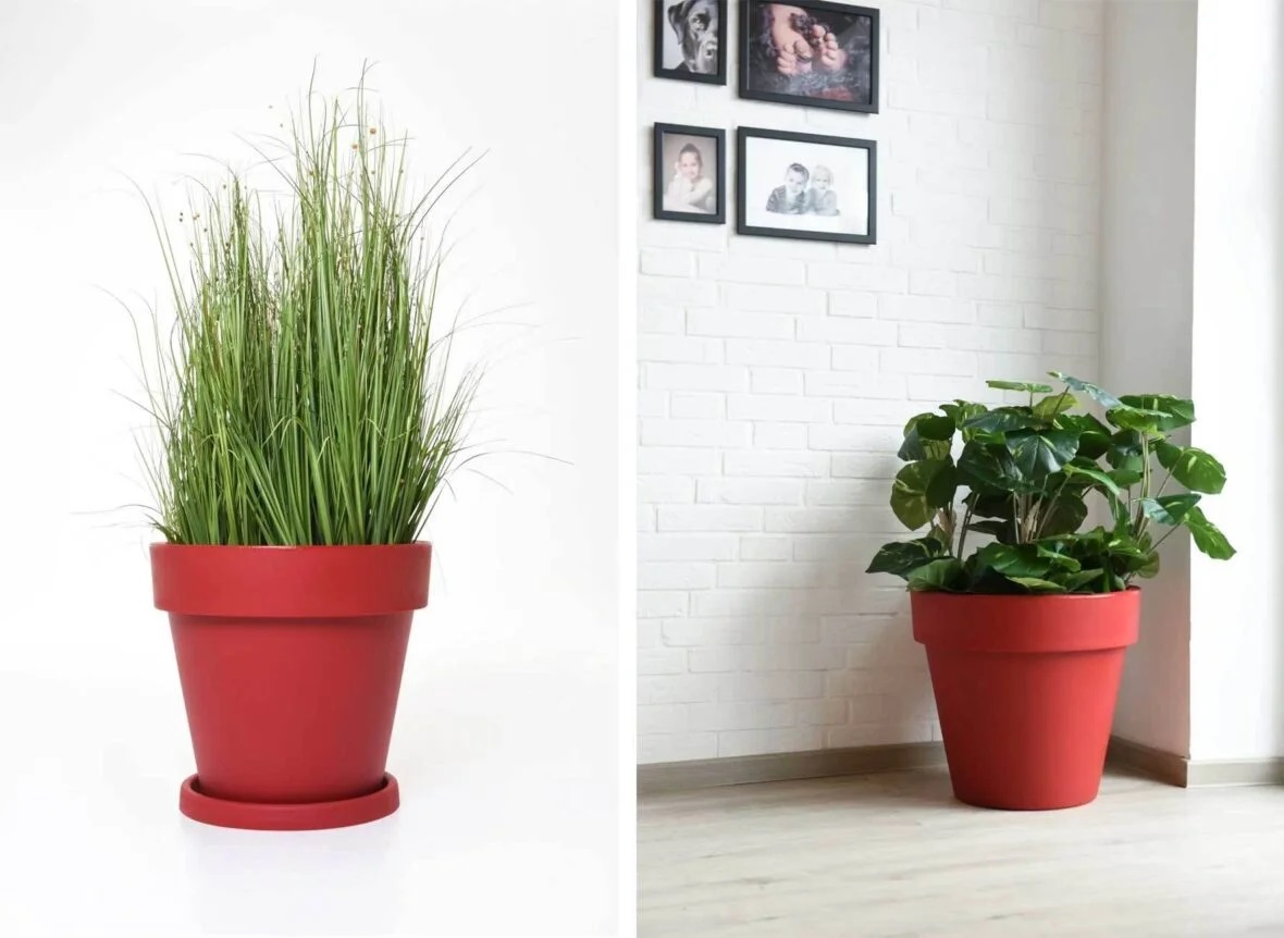 Zde například LEVANTA v červené barvě: jednou s červenou miskou pod květináč PLATO, jednou bez.