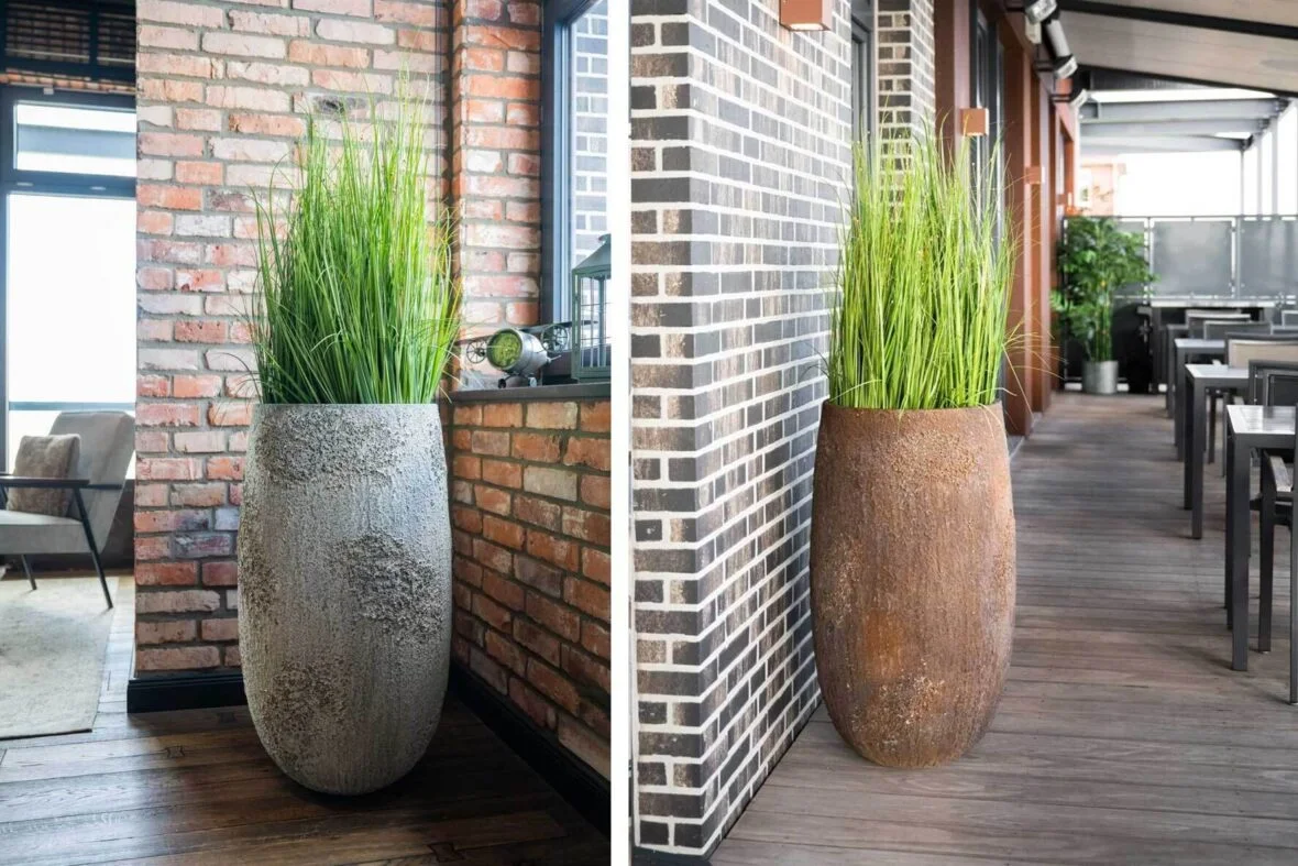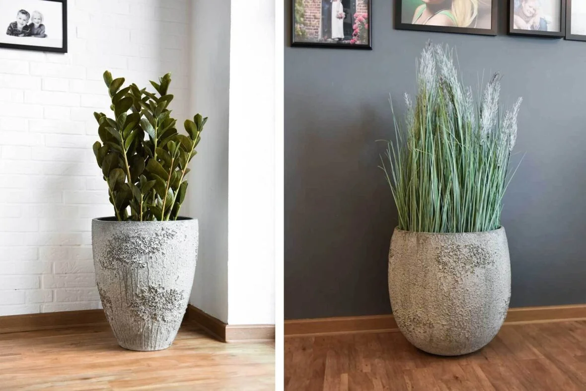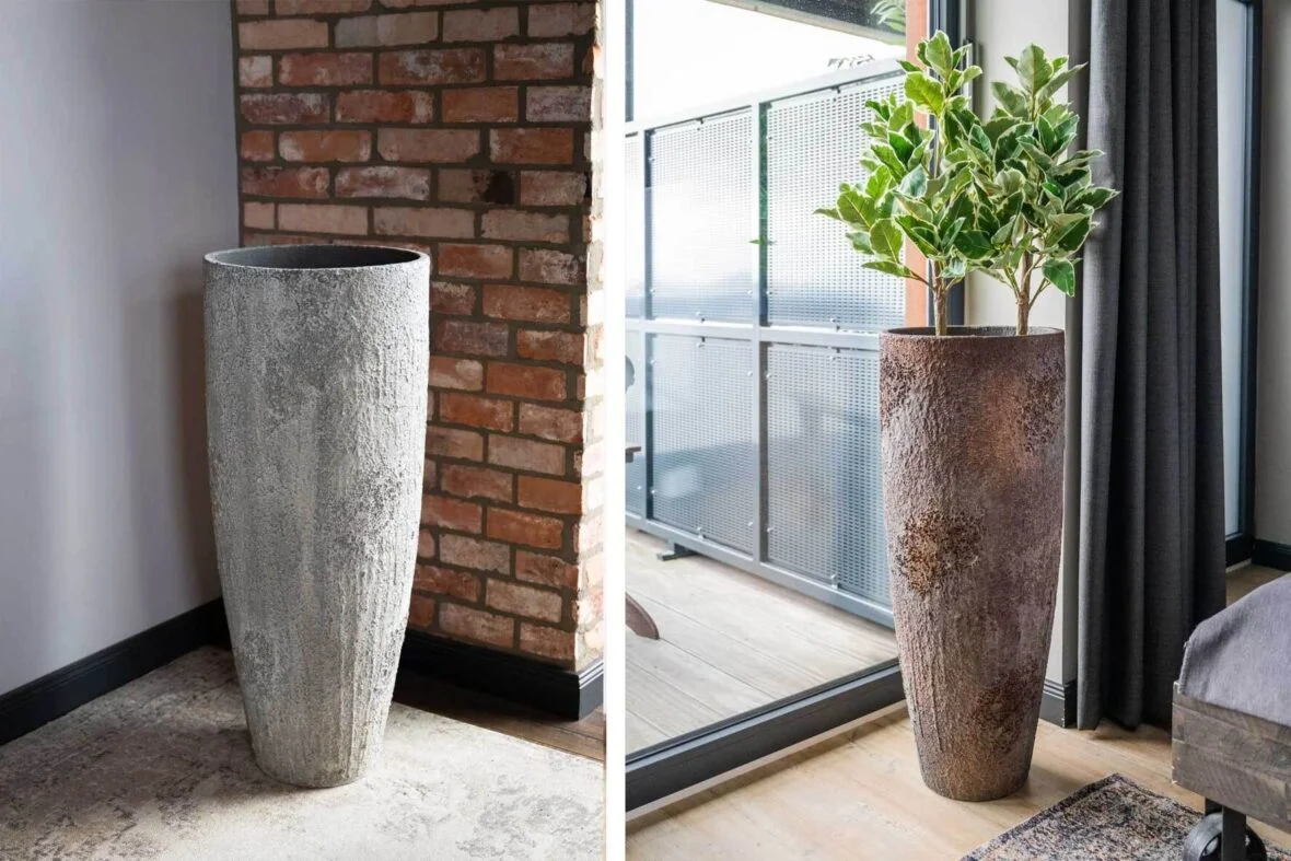 Úzké nebo kulaté květináče střední velikosti najdete v modelové řadě OPALA a AVALAR. S šedobílou nebo hnědou strukturou nádherně ladí zelené umělé trávy nebo sušené květiny, umístěním v interiéru docílíte krásného bytového doplňku.
