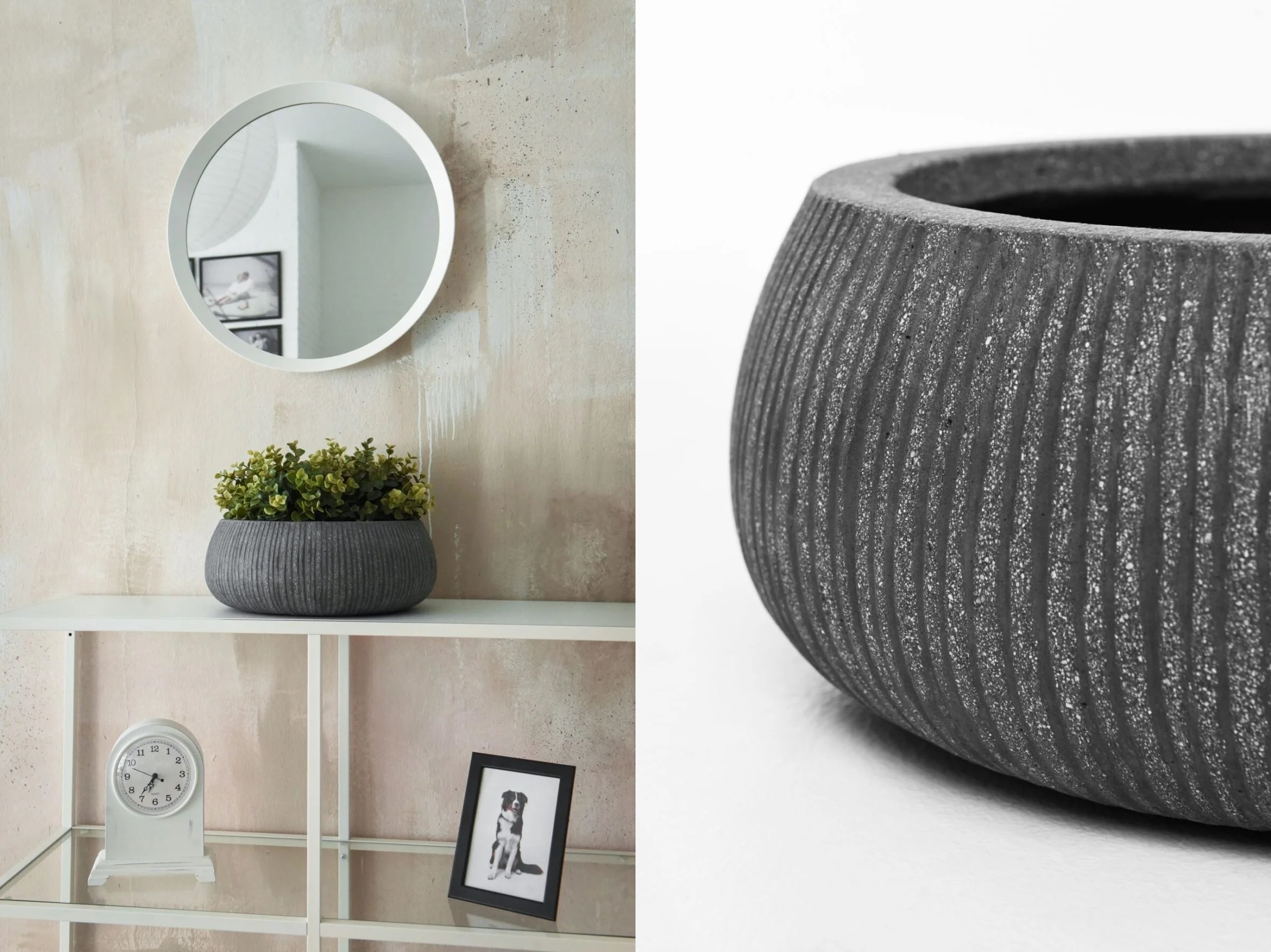 Nový květináč CHICO je k dispozici ve třech oblíbených barvách: v antracitové, krémové nebo bílé. Kulatý květináč ladí s mnoha různými styly zařízení. Fotografie CHICO v antracitové barvě