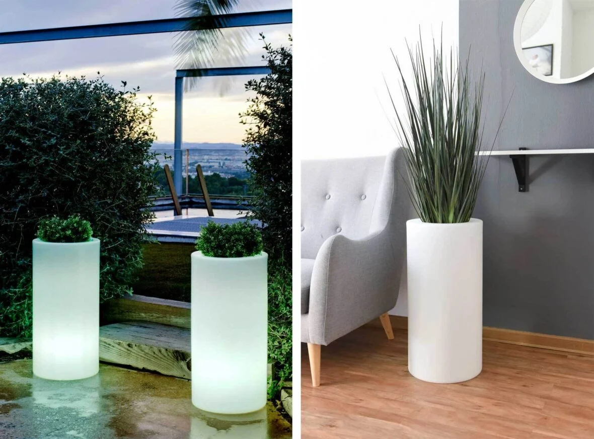 Ve výčtu novinek by samozřejmě neměly chybět vysoké květináče: kulaté sloupy a štíhlé vázy mají velký smysl i jako svítící varianty. Vypadají elegantně téměř v každé konstelaci a formaci a lze je využít tak, aby šetřily místo. (A pro péči o rostliny se jen stěží budete muset sehnout!)