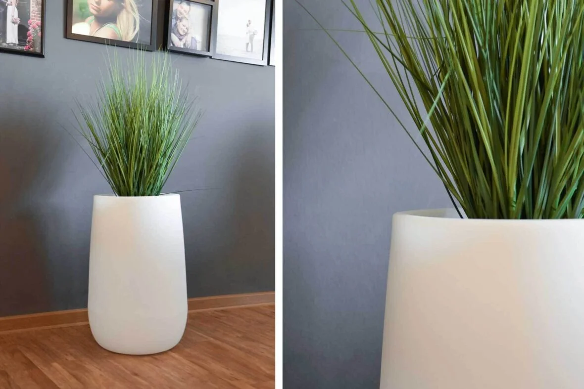 Vzhledem k novým rozměrům 40 x 90 cm a 40 x 70 cm (Ø x výška) to není překvapivé. Proporce obou variant jsou vyvážené, se zářivou bílou působí elegantně a nadčasově. Na fotografiích jsou dva květináče CITY „osázeny“ umělými trávami, které nevyžadují velký objem půdy k růstu.