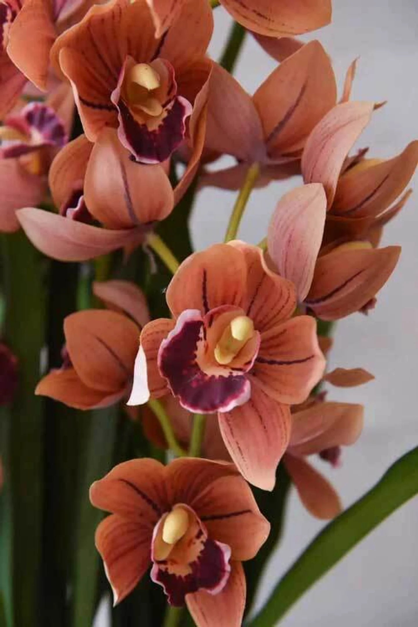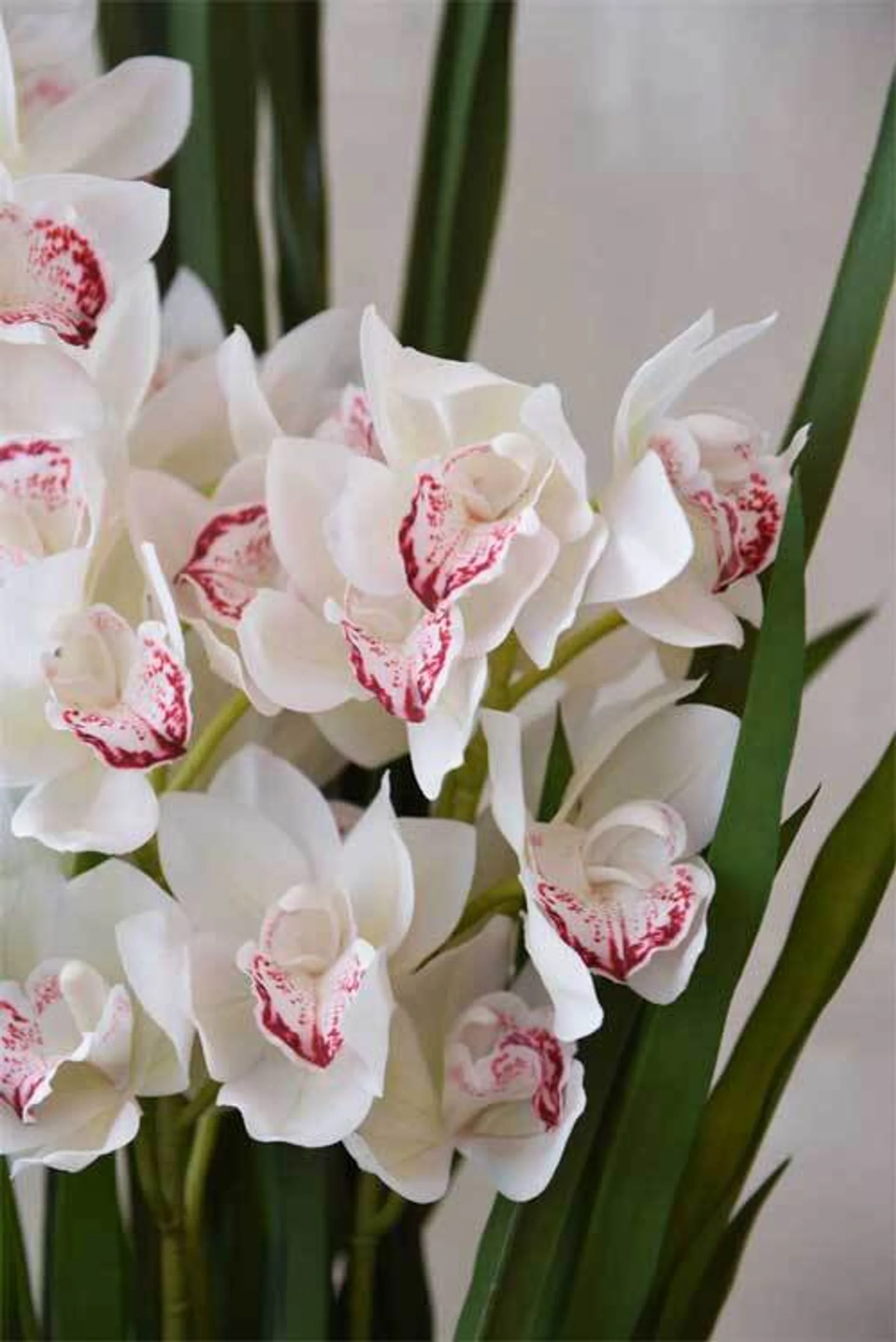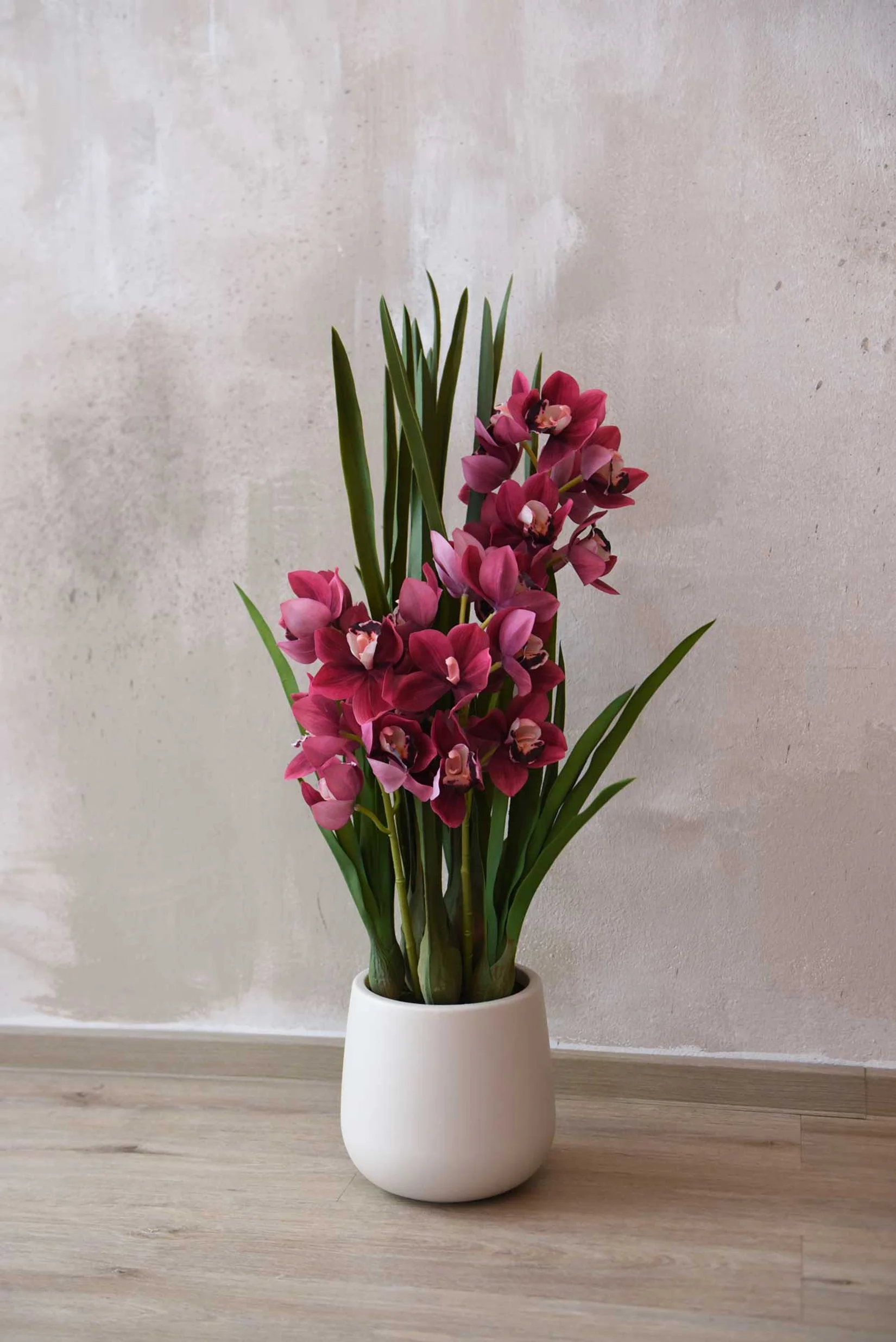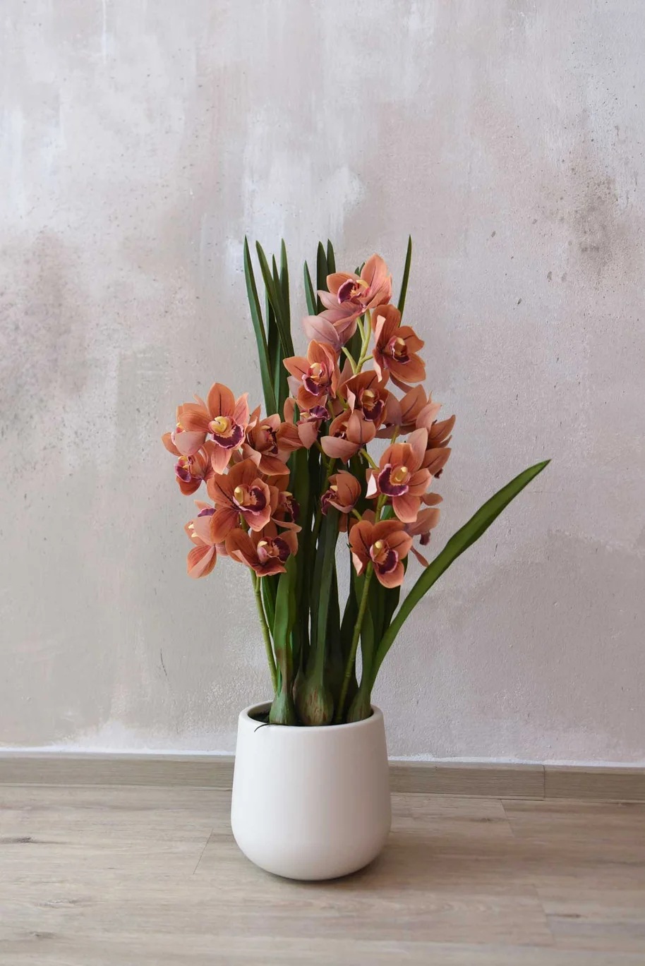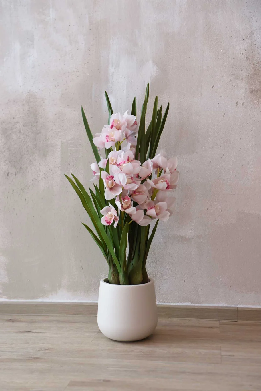 Umělá orchidej ORCHIDEA do nejmenšího detailu odpovídá svému přírodnímu vzoru, orchideji Cymbidium, která je ceněná pro svou působivou hojnost květů. Není krásná? Voskované okvětní lístky z jemné látky jsou individuálně ručně vyráběné, lze jen tiše obdivovat realistické provedení samotných květů.