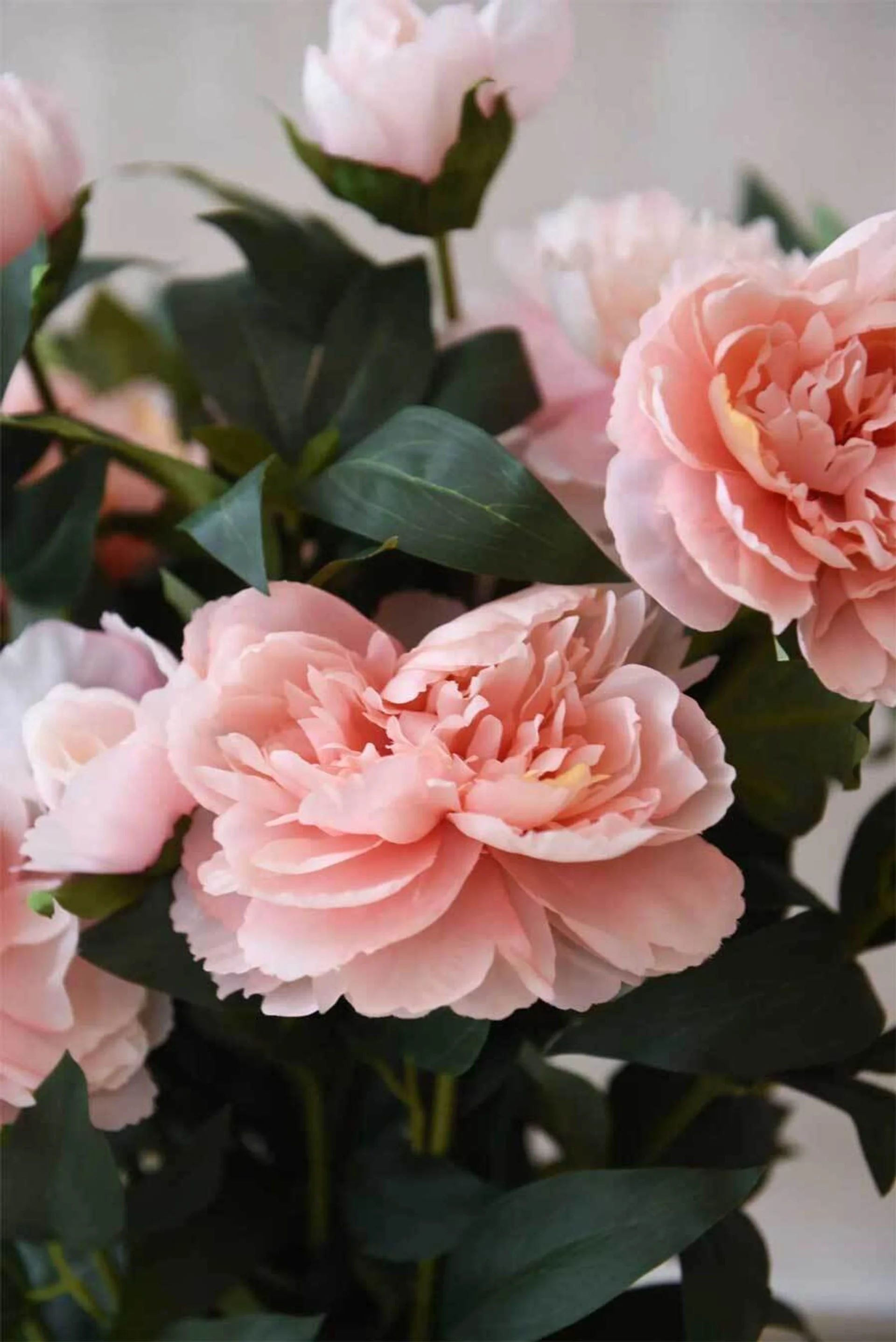 Umělé pivoňky v pokojovém květináči kvetou po celý rok.